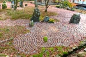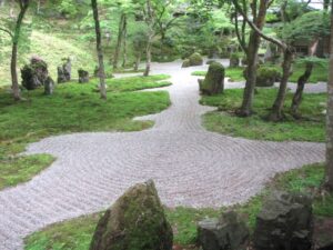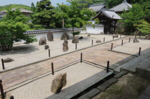 光明寺は太宰府天満宮の近くにある臨済宗東福寺派に属する禅宗寺院で、境内には重森三玲(しげもり みれい)による作庭の九州には唯一残る枯山水の庭園がある。