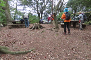 左の椿があるところが飯盛城跡、右の人が立っているところが天拝山頂